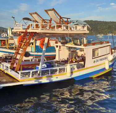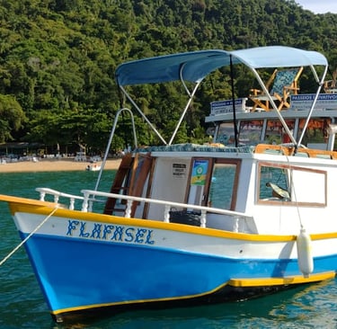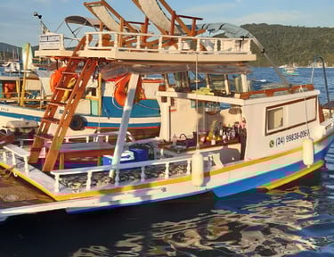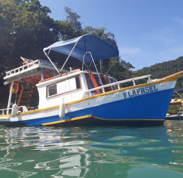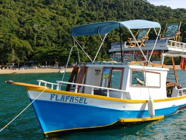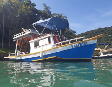 O Barco Flaflasel é uma excelente opção para quem deseja explorar a bela Bahia de Paraty, RJ. Com capacidade para 10 pessoas, é ideal para um passeio privativo inesquecível. É necessário fazer a reserva com antecedência, já que o passeio tem duração de 5 horas e inclui de 3 a 4 paradas, cujo roteiro pode ser combinado conforme a preferência do grupo. Durante a aventura, os passageiros têm acesso a diversos equipamentos para locação, como caiaques e máscaras de mergulho, além de itens para garantir o conforto, como coletes salva-vidas, espaguete para relaxar na água e um cooler para bebidas. O barco também conta com som via Bluetooth, churrasqueira e ducha de água doce, além de toalete, proporcionando uma experiência completa e agradável no mar.
